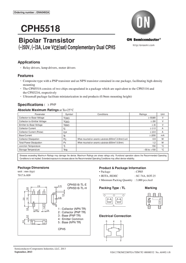 Bipolar Transistor, (-)50V, (-)3A, Low VCE(sat), Complementary Dual CPH5