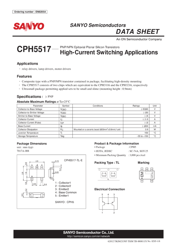 Bip Transistor (-)50V (-)1.0A VCE(sat);(-380)190mV max. PNP+NPN CPH5