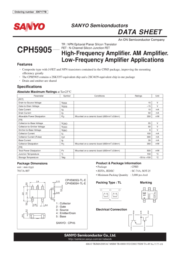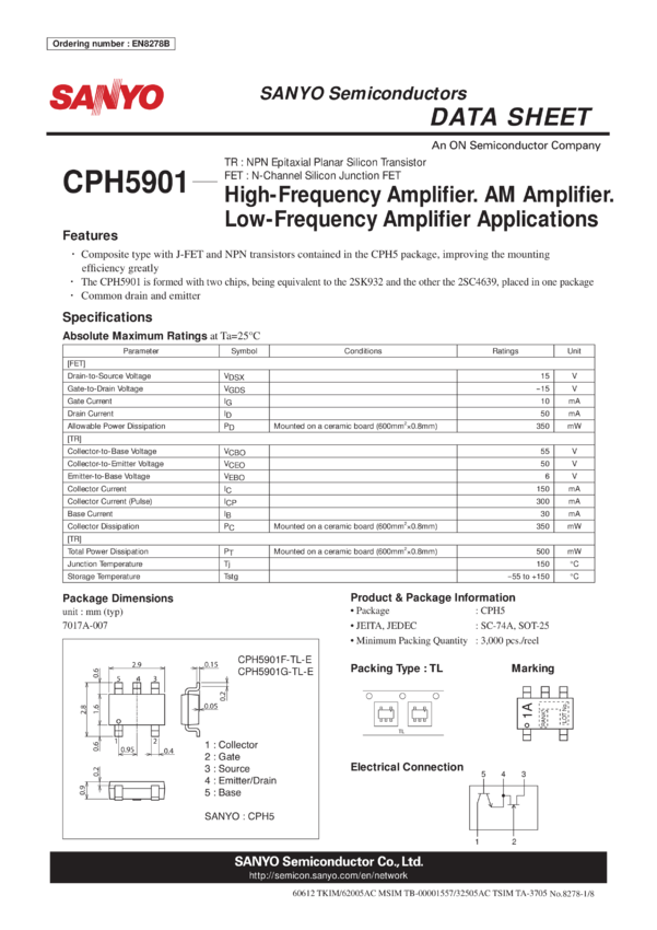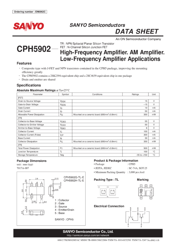 Nch Junction-FET 15V 50mA IDSS 6 to 20 mA and NPN BipTR 50V 150mA VCE(sat);0.4mV max. Two in one type CPH5