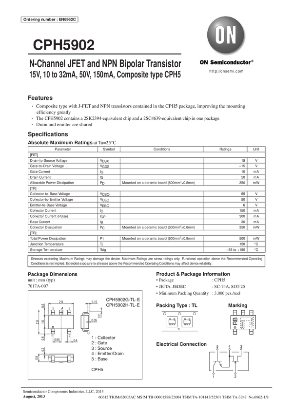 N-Channel JFET and NPN Bipolar Transistor, 15V, 10 to 32mA, 50V, 150mA, Composite type, CPH5