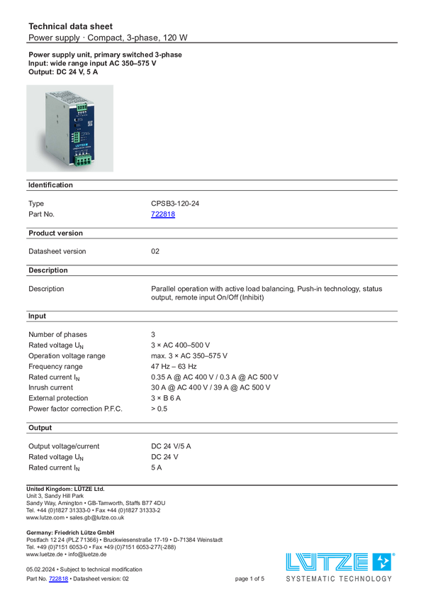 Zasilacz przełączający Lütze CPSB3-120-24 722818 24 V/DC 5 A 120 W