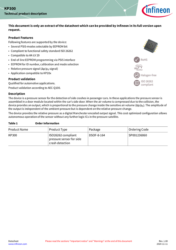 XENSIV™ - KP300 pressure sensor IC for side crash detection and pedestrian protection The Infineon XENSIV KP300 is a pressure sensor used for side crash detection in passenger cars. It is assembled in a door module within the car's side door and provides an output proportional to the pressure change inside the sensitive air volume (∆p/p0). The relative pressure is provided as a digital Manchester encoded output signal, enabling autonomous sensor operation without additional logic ICs in the pressure satell