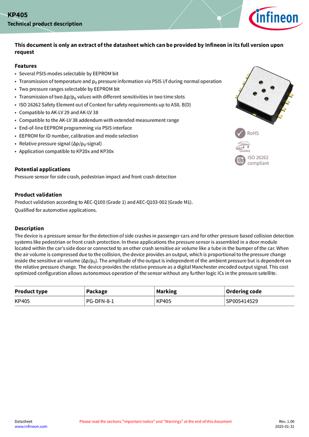 XENSIV™ - KP305 pressure sensor IC for side crash detection and pedestrian protection The Infineon XENSIV KP305 is a pressure sensor for side crash detection in passenger cars and other collision detection systems. It provides an output proportional to the pressure change inside a crash-sensitive air volume, offering relative pressure as a digital Manchester encoded output signal for autonomous operation without additional logic ICs.