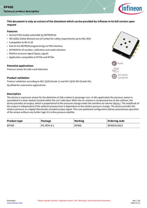 XENSIV™ - KP400 pressure sensor, ISO 26262-compliant for side crash, pedestrian impact and front crash detection in small DFN package The KP400 is a monolithically integrated pressure sensor with a programmable PSI5 interface, designed for passive safety vehicle systems. It provides fast reaction times and helps fulfill existing and future safety tests. Used in side airbag applications, the KP400 offers a signal pulse proportional to pressure change, with an amplitude independent of ambient pressure. It's