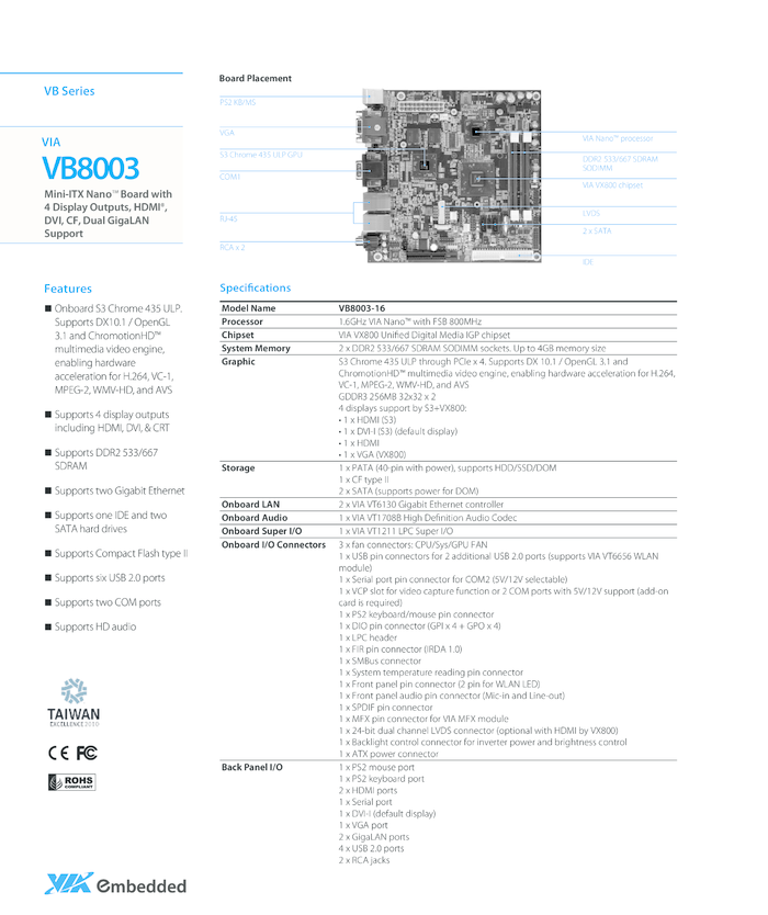 Płyta główna Mini-ITX 1.6GHz Nano E CPU, 2 x HDMI, DVI, CRT, USB, COM, CF, IDE, SATA, GigaLAN, produkt wycofywany z produkcji,