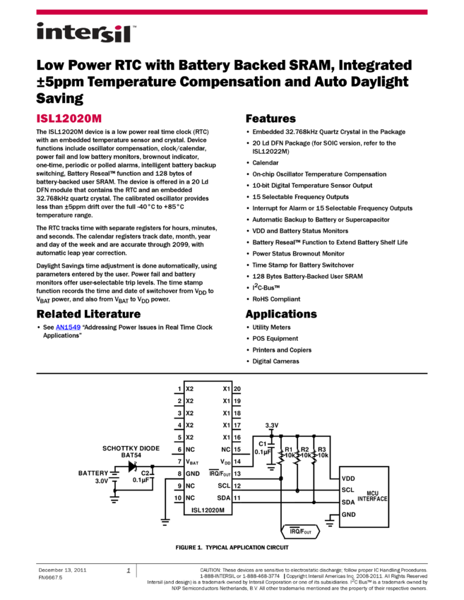 IC-Bus™ Real Time Clock with Two Interrupts, Alarm, and Timer Low Power RTC with Battery ReSeal™, 2 IRQs, Hundredths of a Second Time, and Crystal Compensation