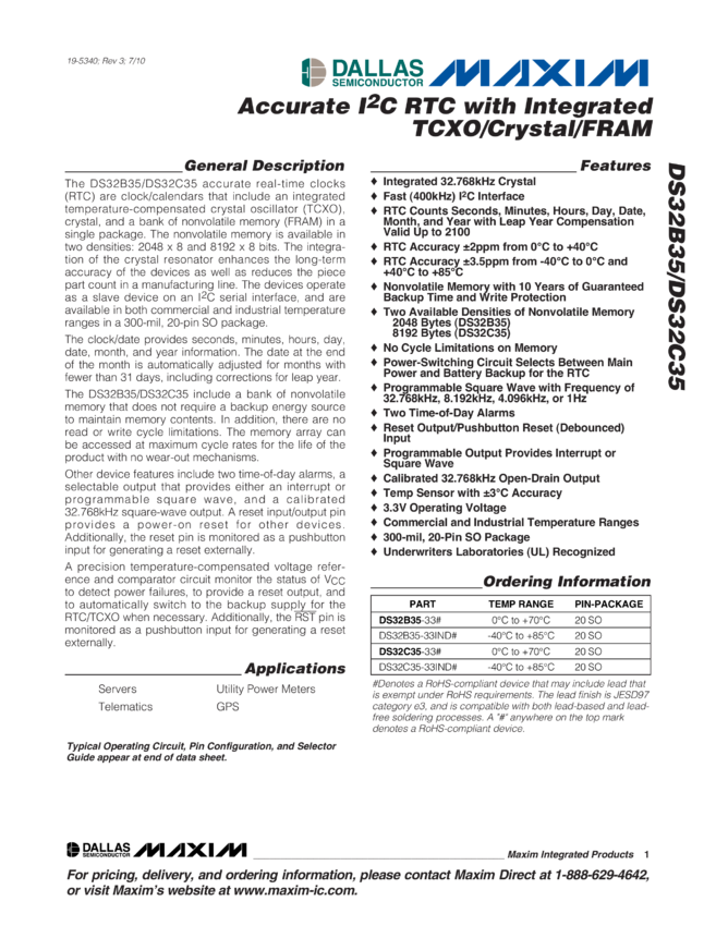 DS32B35, DS32C35 Accurate I²C RTC with Integrated TCXO/Crystal/FRAM