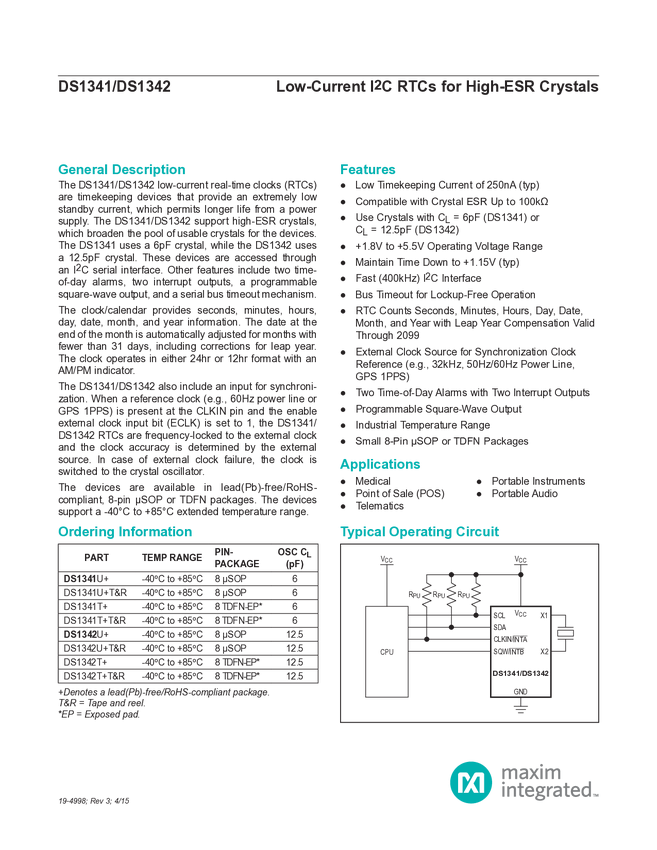 DS1341, DS1342 Low-Current I²C RTCs for High-ESR Crystals
