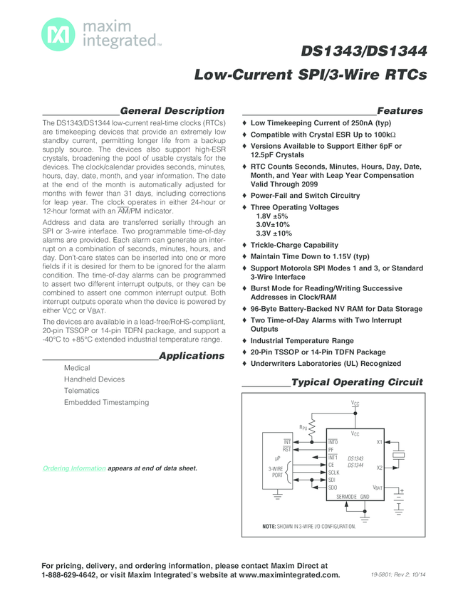 DS1344 Low-Current SPI RTC for 12.5pF High-ESR Crystals