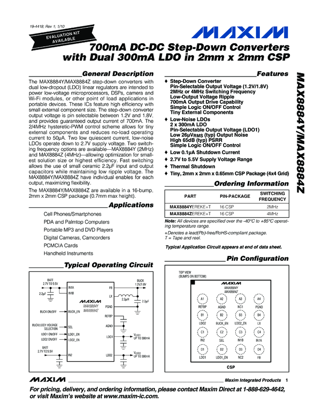 MAX8884Y, MAX8884Z 700mA DC-DC Step-Down Converters with Dual 300mA LDO in 2mm x 2mm CSP