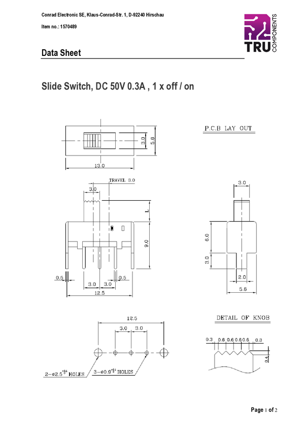 Przełącznik suwakowy 50 V/DC 0.03 A 2 x wyłącz/włącz CSS-1202A 1 szt.