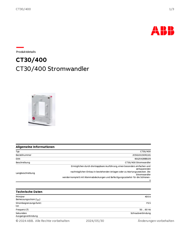 ABB CT30/400 2CSG101150R1101 Przekładnik prądowy Prąd pierwotny 400 A Prąd wtórny 5 A Średnica otworu:156 mm 1 szt.