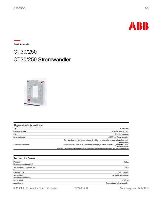 ABB CT30/250 2CSG101130R1101 Przekładnik prądowy Prąd pierwotny 250 A Prąd wtórny 5 A Średnica otworu:156 mm 1 szt.
