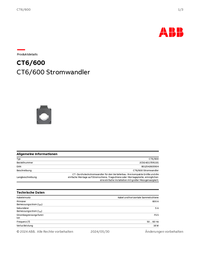 ABB CT6/600 STROMWANDL Przekładnik prądowy Prąd pierwotny 600 A Prąd wtórny 5 A Średnica otworu:0 mm 1 szt.