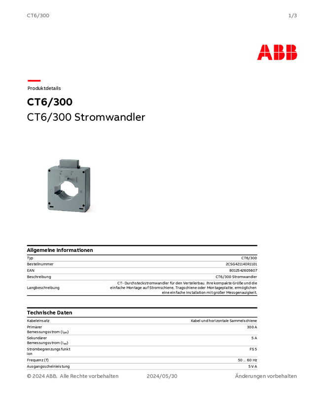 ABB CT6/300 STROMWANDL 2CSG421140R1101 Przekładnik prądowy Prąd pierwotny 300 A Prąd wtórny 5 A Średnica otworu:0 mm 1 s