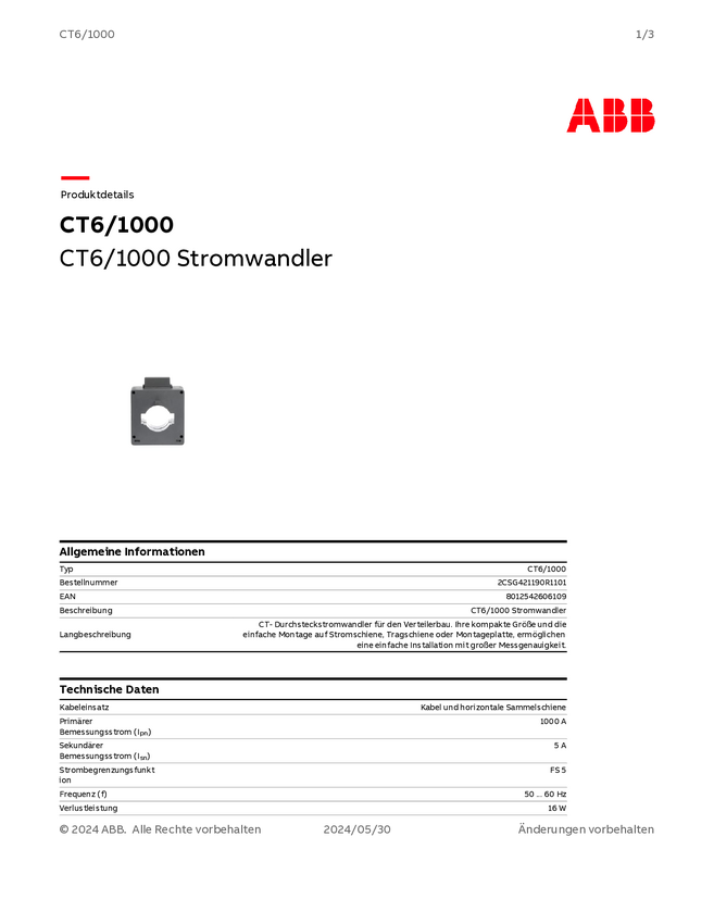 Przekładnik prądowy ABB CT6/1000 STROMWAND, Prąd pierwotny 1000 A, Prąd wtórny 5 A, 1 szt.