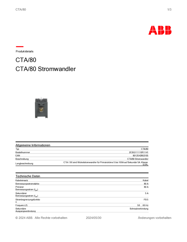 Przekładnik prądowy ABB CTA/80 STROMWANDLE, Prąd pierwotny 80 A, Prąd wtórny 5 A, 1 szt.