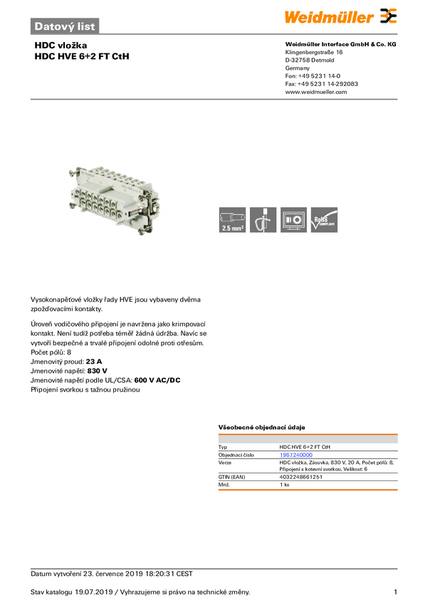 Weidmüller HDC HVE 6+2 FT CTH 1967240000 Wkładka złącza żeńskiego 1 szt.