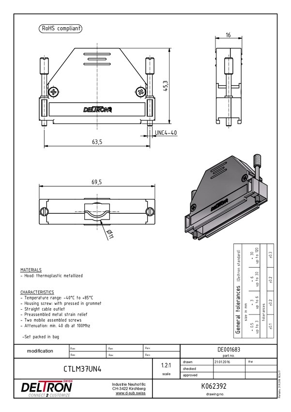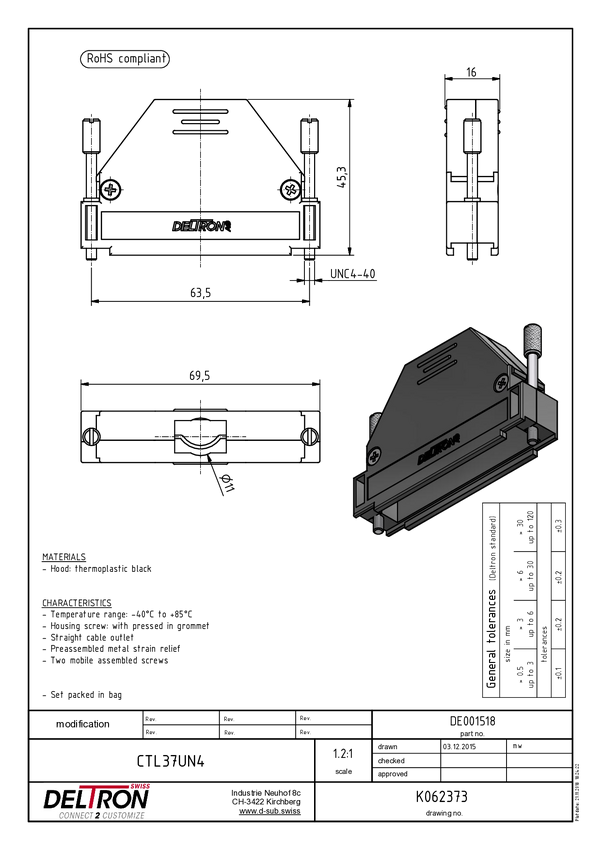 Deltron Connectors CTLM37UN4 Obudowa złącza D-SUB Deltron, tworzywo sztuczne, metalizowane, 180 °, 1 szt.