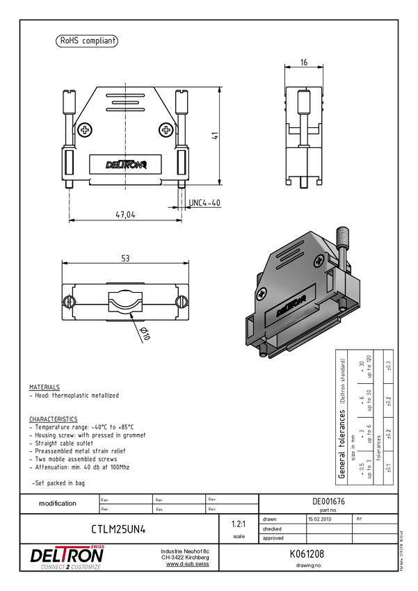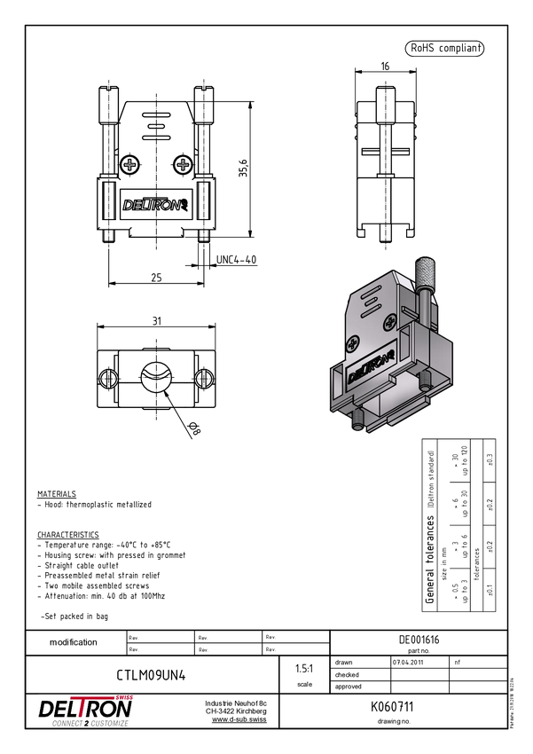 Deltron Connectors Deltron CTLM09UN4 Obudowa złącza D-SUB Ilość styków: 9 tworzywo sztuczne, metalizowane 180 ° metal 1