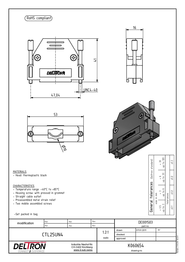 Deltron Connectors CTL25UN4 Obudowa złącza D-SUB Deltron, tworzywo sztuczne, 180 °, 1 szt.