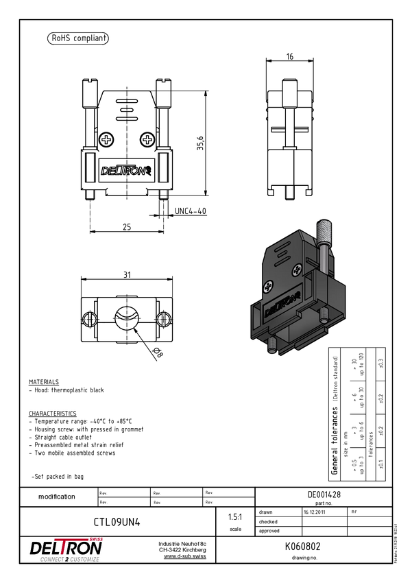 Deltron Connectors CTL09SUN4 Obudowa złącza D-SUB Deltron, tworzywo sztuczne, 180 °, 1 szt.