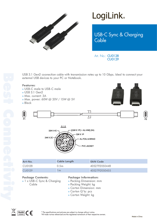 Kabel LogiLink CU0129 USB-C 3.1 Gen2 o długości 1,0 m, czarny