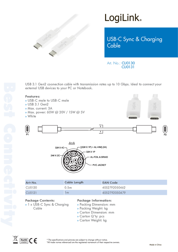 LogiLink Kabel USB USB 3.2 Gen1 Złącze męskie USB-C®, Złącze męskie USB-C® 1.00 m biały CU0131