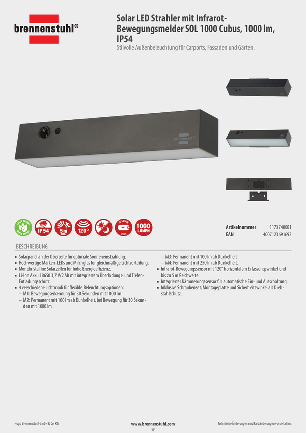 Lampa ścienna solarna Brennenstuhl SOL 1000 Cubus 1173740001 6.9 W 1000 lm IP54
