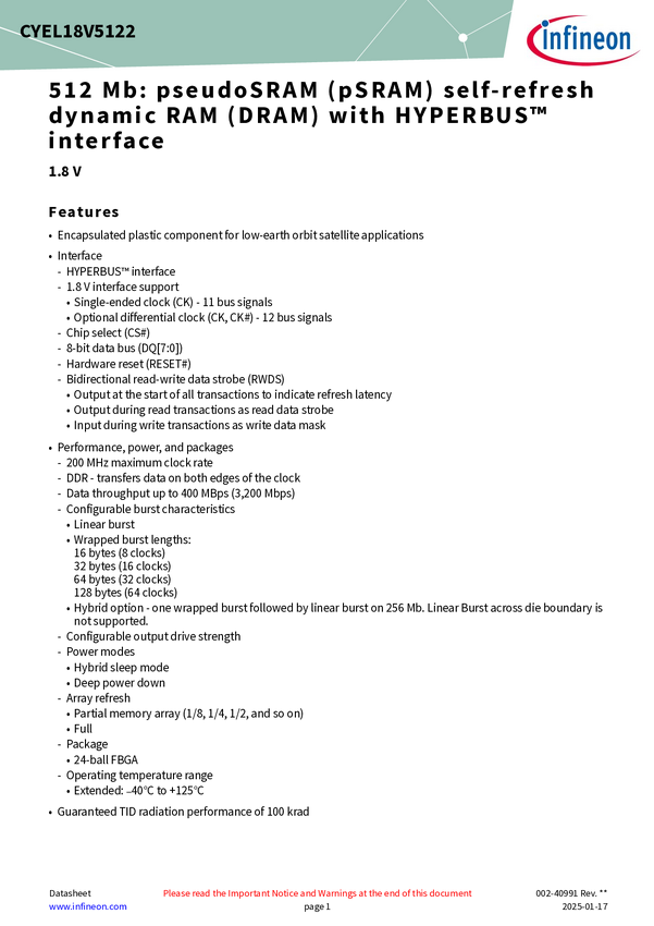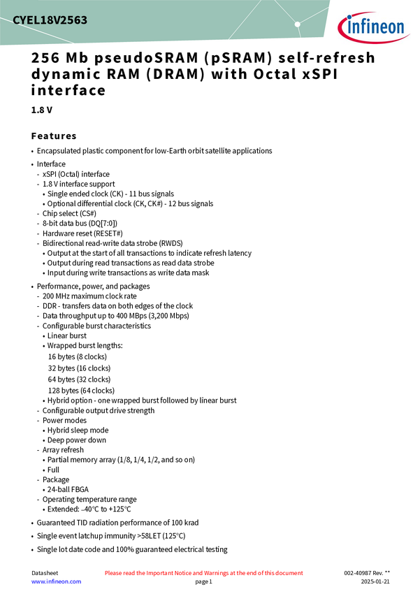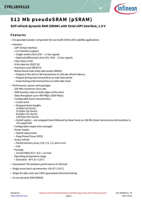 Radiation tolerant, low-power, high bandwidth Pseudostatic RAM (pSRAM) in a small footprint Infineon's pSRAM is a cutting-edge memory solution that combines the benefits of both DRAM & SRAM. Internally, it's structured like a DRAM, but externally, it behaves like an 8 channel serial SRAM. This technology is packaged in a compact, low pincount plastic component that boasts high-speed performance and a small footprint, making it an ideal choice for applications in low-earth orbit satellites that require