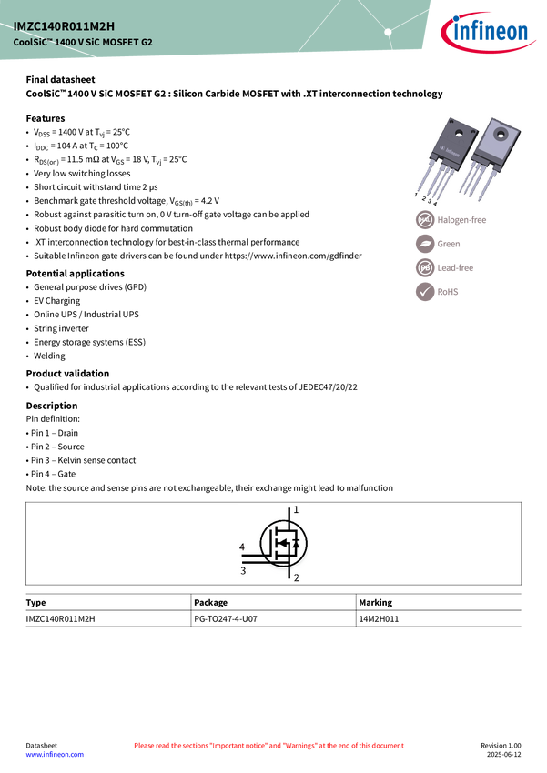 CoolSiC™ MOSFET discrete 1400 V in TO-247 4pin package with high creepage CoolSiC™ MOSFET discrete 1400 V, 11 mΩ G2 in TO-247 4pin combines cutting-edge SiC technology with robust high-creepage package. It enables designs with bus voltages beyond 1000 V. For existing applications, it offers both additional voltage margin and enhanced reliability. Furthermore, it allows increased switching speed leading to higher efficiency. Pin-to-pin compatible, it is suitable for PV, EV charging, and other industrial app
