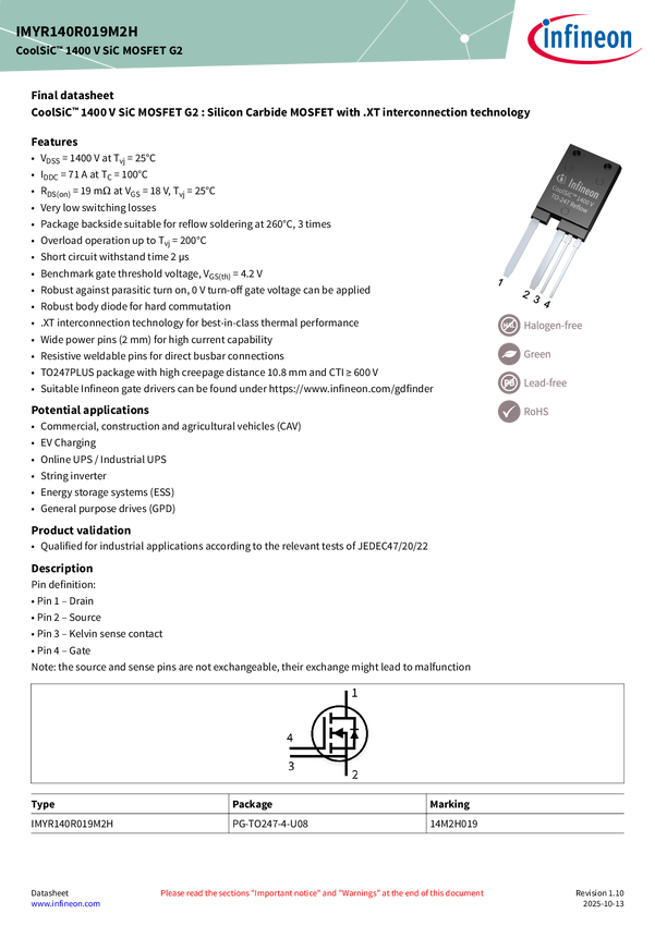 CoolSiC™ MOSFET discrete 1400 V in TO-247 4pin package with high creepage CoolSiC™ MOSFET discrete 1400 V, 19 mΩ G2 in TO-247 4pin combines cutting-edge SiC technology with robust high-creepage package. It enables designs with bus voltages beyond 1000 V. For existing applications, it offers both additional voltage margin and enhanced reliability. Furthermore, it allows increased switching speed leading to higher efficiency. Pin-to-pin compatible, it is suitable for PV, EV charging, and other industrial app