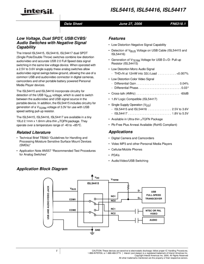 Low Voltage, Dual SPDT, USB/CVBS/Audio Switches with Negative Signal Capability
