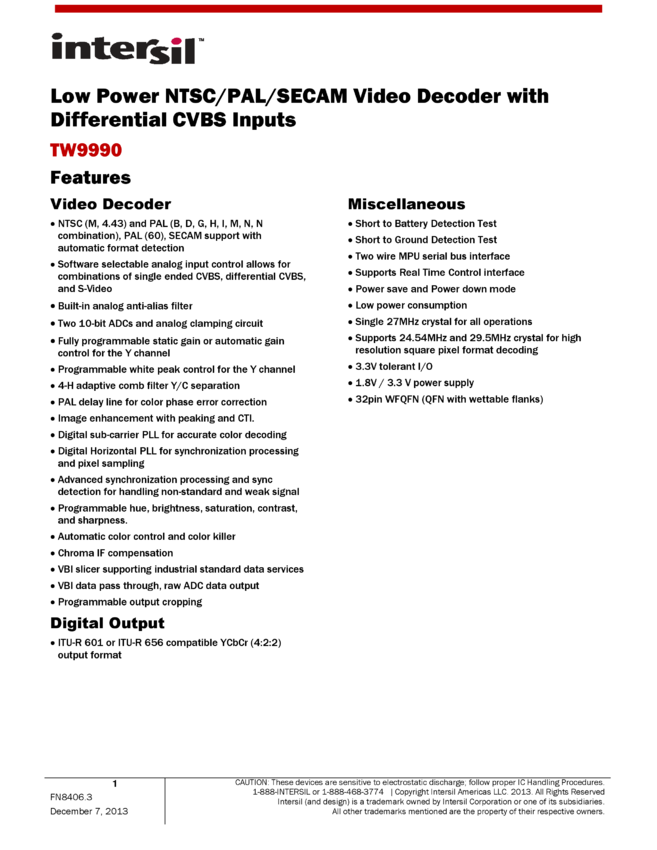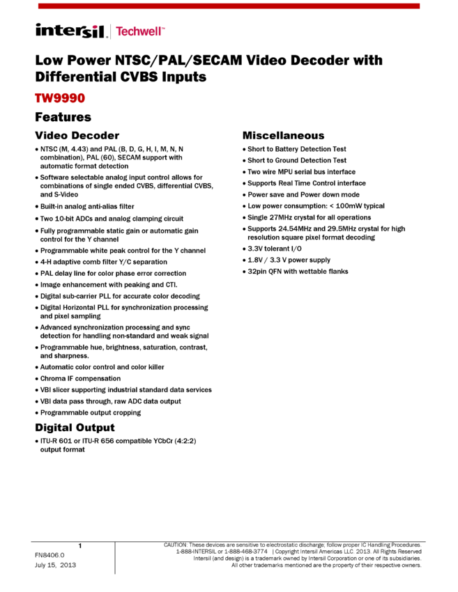 Low Power NTSC/PAL/SECAM Video Decoder with Differential CVBS Inputs