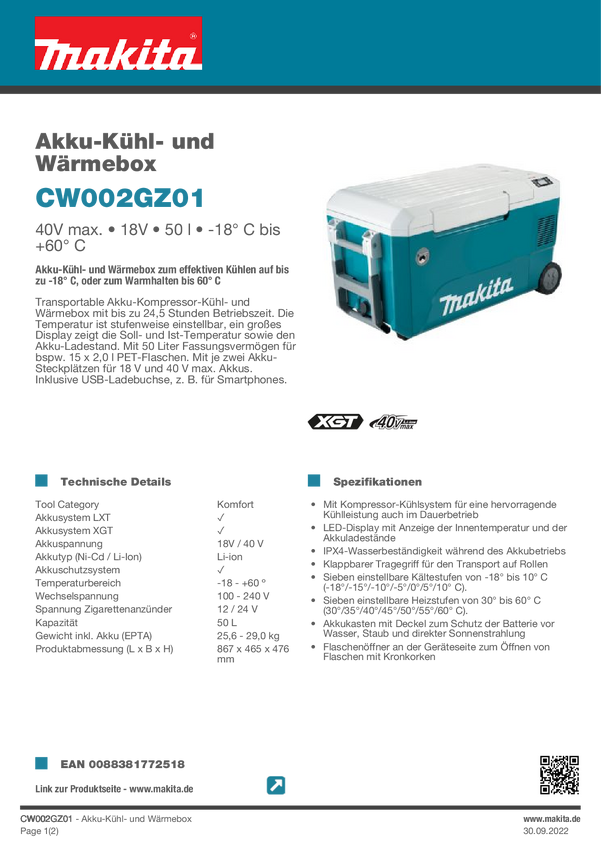 Makita CW002GZ01 Lodówka akumulatorowa i skrzynka grzewcza 12 V/DC, 18 V/DC, 40 V/DC, 240 V/AC turkusowy, biały 50 l -18