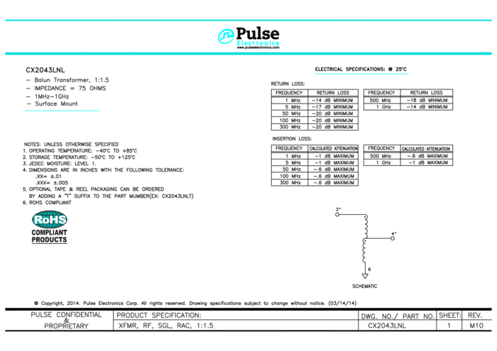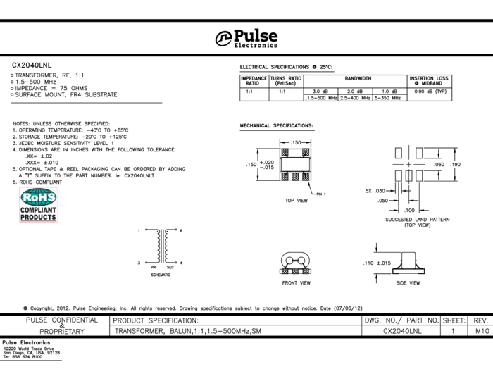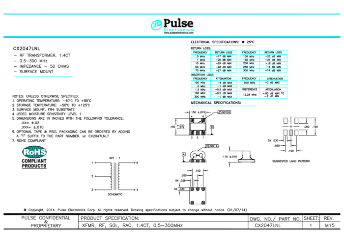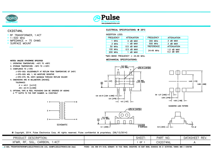 RF Transformer 1:1.414 0.5MHz to 1500MHz Surface Mount