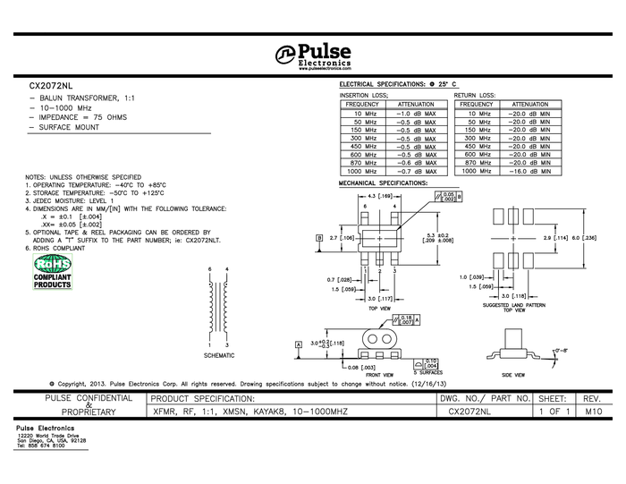 RF Transformer 10MHz to 1000MHz Surface Mount
