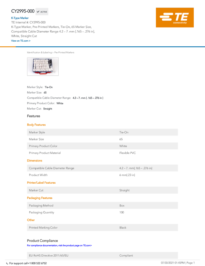 TE Connectivity CY2995-000 TE RAY Cable Identification - Non-Computerized