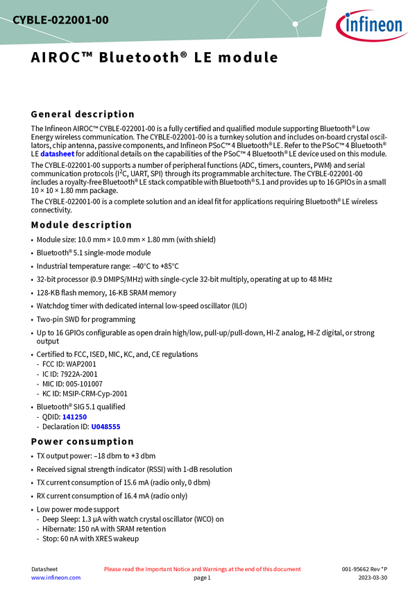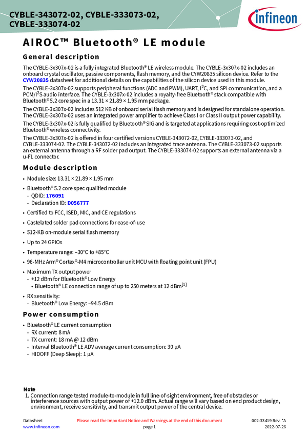 Infineon’s AIROC™ CYBLE-333073-02 is a fully certified Bluetooth® LE module based on Infineon’s CYW20835. This embedded module includes a royalty-free Bluetooth® stack compatible with Bluetooth® 5.0 and is available in 13.31 x 21.89 x 1.95 mm SMT form-factor. This module complies with Bluetooth® Core 5.2 and has gone through Qualification with Required Testing path with Declaration ID D056777 and QDID 176091.