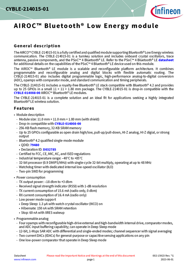 Infineon’s AIROC™ CYBLE-214015-01 is a fully certified Bluetooth® LE embedded module based on Infineon’s PSOC™ 4-BLE. This module includes a royalty-free Bluetooth® stack compatible with Bluetooth® Core 5.1, reducing the additional time needed for design, development and certification. It is available in 11 x 11 x 1.70 mm SMT form-factor, with a PCB trace antenna and is certified to FCC, ISED, MIC, and CE regulations.