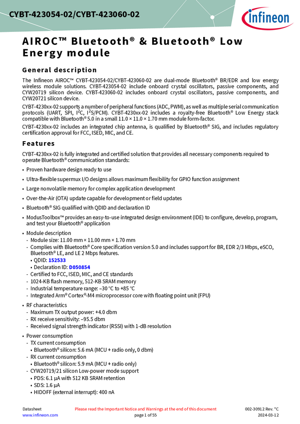 Infineon’s AIROC™ CYBT-213043-02 is a fully certified Bluetooth® and Bluetooth® LE module based on Infineon’s CYW20819. This embedded module is available in 12 x 16.61 x 1.70 mm SMT form-factor. Infineon’s AIROC™ CYBT-213043-02 module complies with Bluetooth® Core 5.4 and have gone through Qualification with Required Testing path with Declaration ID D043205 and QDID 154138.