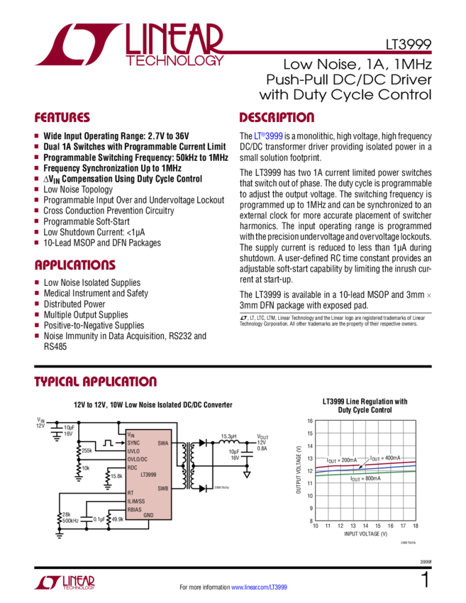 Low Noise, 1A, 1MHz Push-Pull DC/DC Driver with Duty Cycle Control
