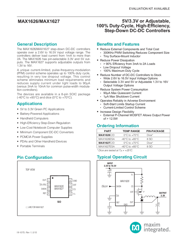 MAX1627 Adjustable-Output, 100% Duty-Cycle, High-Efficiency, Step-Down DC-DC Controller