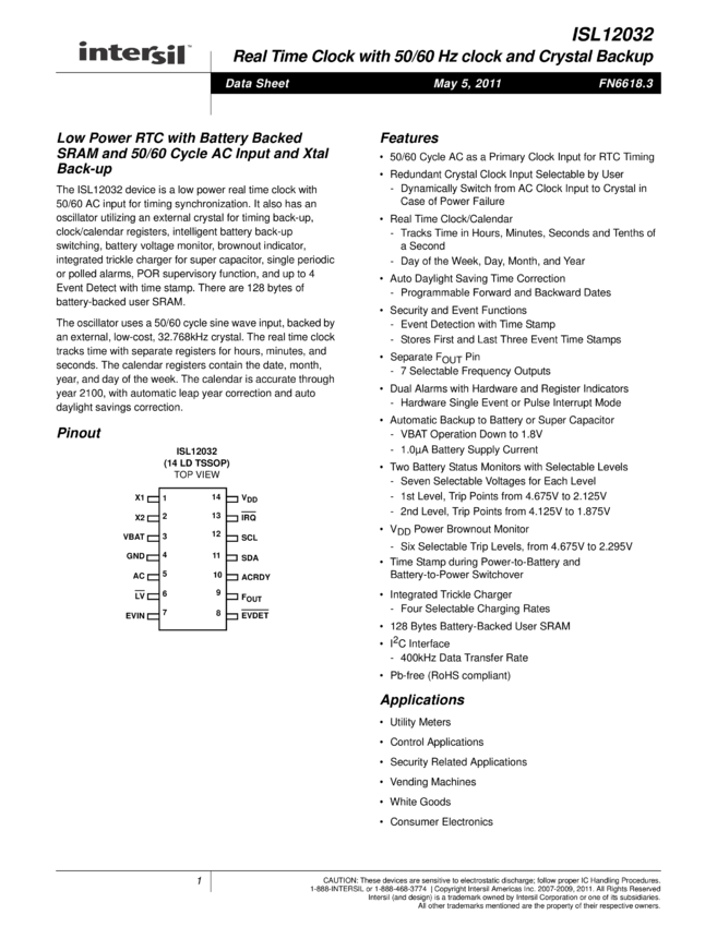 Low Power RTC with Battery Backed SRAM and 50/60 Cycle AC Input and Xtal Back-up
