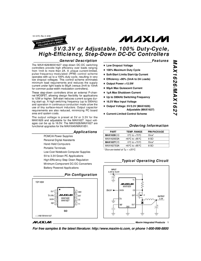 MAX1626, MAX1627 5V/3.3V or Adjustable, 100% Duty Cycle, High-Efficiency, Step-Down DC-DC Controllers