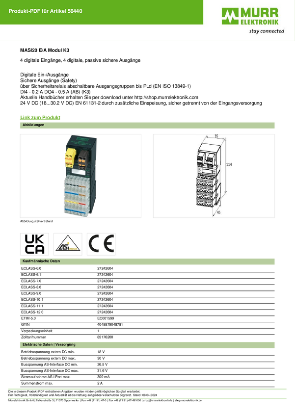 Murrelektronik 56440 56440 Moduł I/O Liczba wyjść cyfrowych: 4 Liczba wejść cyfrowych: 4