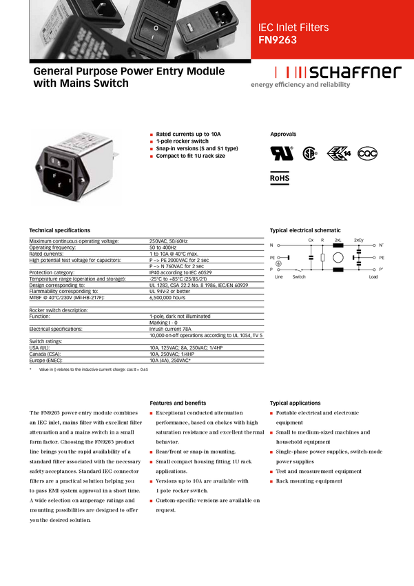 Schaffner FN 9263-1-06 FN 9263-1-06 Filtr sieciowy z gniazdem nie generującym ciepła 250 V/AC 1 A 5.3 mH (S x W) 46 mm x