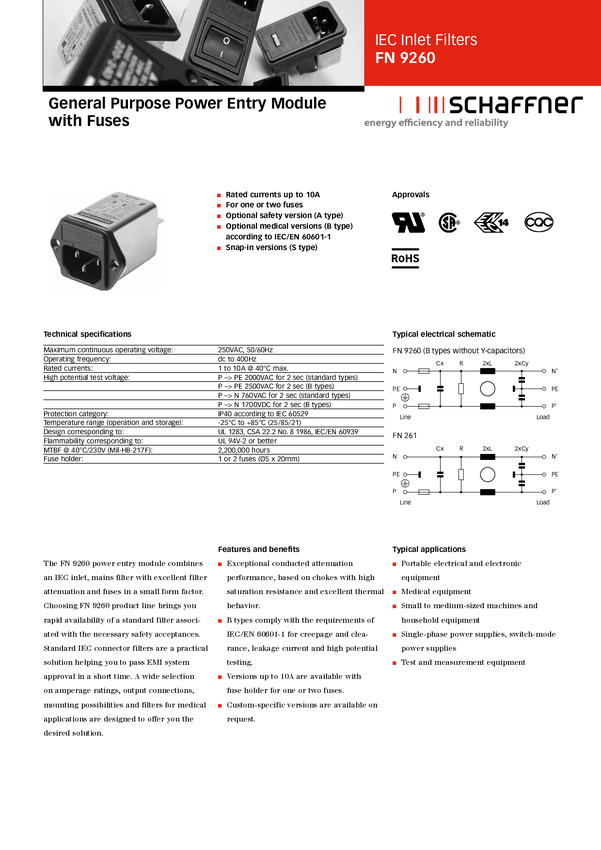 Schaffner FN 9260-1-06 FN 9260-1-06 Filtr sieciowy z gniazdem nie generującym ciepła 250 V/AC 1 A 5.3 mH (S x W) 46 mm x