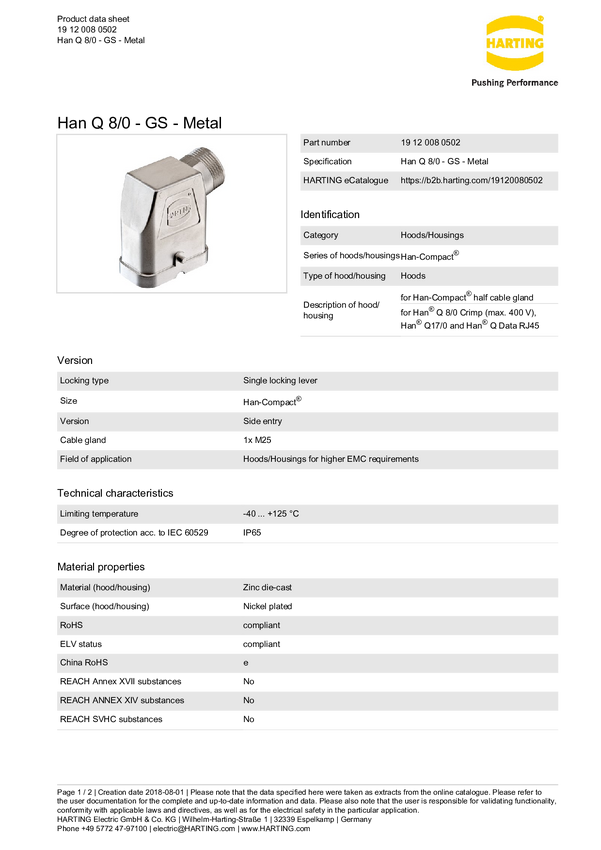 Obudowa tulejki Harting 19 12 008 0502, odlew cynkowy, 1 szt.