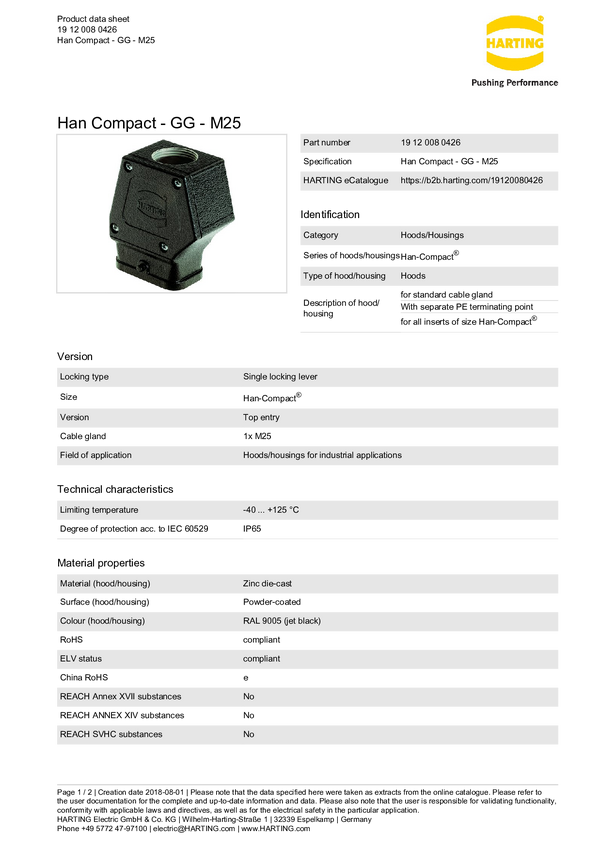 Obudowa tulejki Harting 19 12 008 0426, odlew cynkowy, 1 szt.